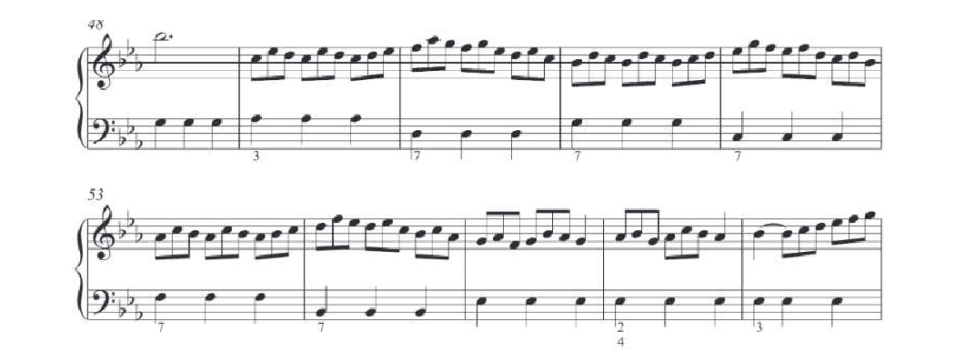 Большое значение автор придает аккомпанементу и необходимости взаимодействия певца и инструменталиста (скорее всего, клавириста). Например, в сольфеджио №13 линия баса фактически образует канон к вокальной мелодии, что требует выстраивания полифонической фактуры (Пример 4). Иными словами, Априле подходит к этим упражнениям не столько как к инструктивным материалам, а старается с их помощью развить у певца вкус к композиции, познанию музыкальной логики, фактуры, ориентации в тональностях и жанровой специфике.