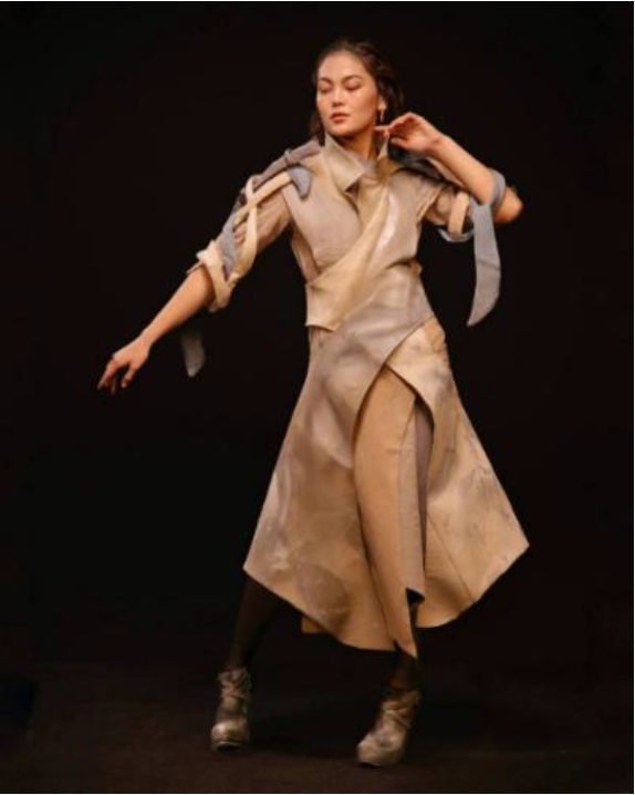 Each line is connected to each other, like neurons in the human mind.” The combination of technological material with high fashion elements of evening wear creates an imagery of a theatrical burst of emotion, a concept of contrasts, which is also reflected in the poster in the image of the model, because ambience and atmosphere covered bubbles of “ironic elements”. The concept or message expressed by image, texture, display of color is different from traditional design where the emphasis is on form, materials, and style. The conceptual approach of the model in the description contains the idea of “samsara – the connection between the past and the future.” Also, there is a paradoxical emphasis – this is the opposition of the decorative texture that envelops the evening dress in a 2-dimensional frame, expressing emotions with plastic, blurring the general direction of the style in pensive melancholy, in the added force fields – a veil of neural materiality, like the object itself – a dress with a non-utilitarian texture.An architectural analogue of incompatible, contrasting materials and textures in the object, the layout uses wire and cardboard (Author Dauletuly Adilet, see Photo No. 2 model). The task was to show the theme of the traditional element of the architecture of the nomadic dwelling kiiz uy – the yurt, and its walls, like a “kerege” lattice enveloping the volume. The model bears the mood of the loss of form and its connections within sphericity in a centric composition that is destroyed – this is a manifesto of irony from the lack of clarity in the understanding of the Big Form in today's aesthetics of Kazakhstan.