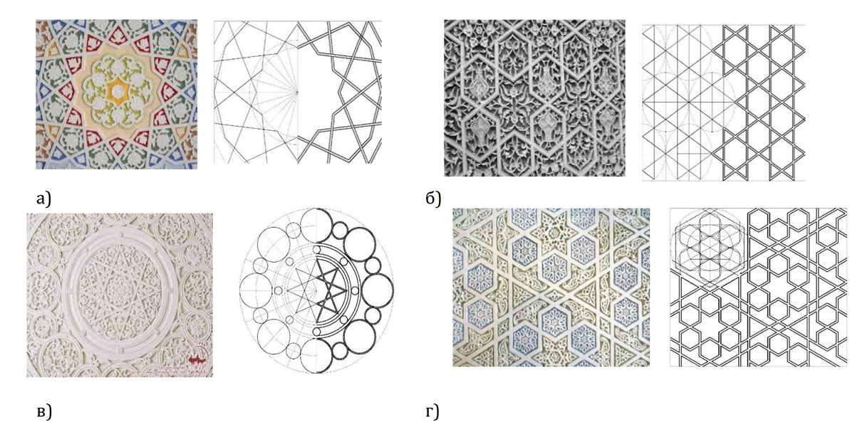 Рис. 3 (а, б, в, г). Использование гириха в резьбе по ганчу, применяемого для декорирования зданий и сооружений.