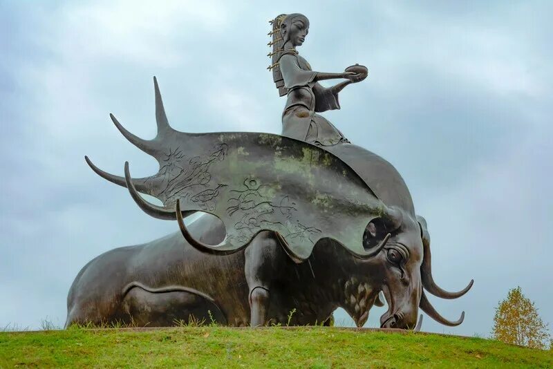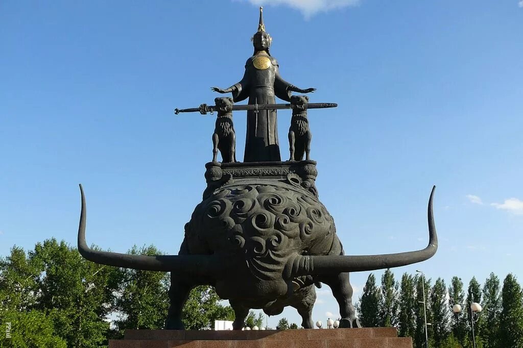 В Казахстане в советское время в разных городах и областях республики были возведены монументы, посвященные памяти погибших воинов в Великой отечественной войне со скульптурой скорбящей матери в центре композиции. В новой столице Казахстана Астане в постсоветское время установлены два монумента, олицетворяющие образ матери. Монумент защитникам отечества скульптора А.К. Бексултанова «Родина-мать» в 2001 г. представляет собой бронзовую стелу с фигурой матери у основания. Мать держит в руках чашу, покрытую тонким слоем сусального золота, символизирующую добросердечное приветствие, гостеприимство. Аллегория добросердечного приветствия и олицетворяет хранительницу домашнего очага и благословляющую мать одновременно. Фоном являются битвы казахов, с одной стороны, с джунгарами, а с другой стороны, участие казахского этноса в Великой отечественной войне 1941-1945 гг. В Астане также установлена скульптура, посвященная матери «защитнице». Монумент «Мать-земля» скульптора Д.Б. Намдакова возведена в новой столице Казахстана в 2008 г. Образ матери представлен древней легендарной сакской царицей Томирис, стоящей на тотемном животном - гигантском быке (рис. 1). На переднем плане по бокам находятся два льва, поддерживающие меч. Скульптура олицетворяет архетип «великой матери», описанный Эрихом Найманом в книге «Великая мать» [12].