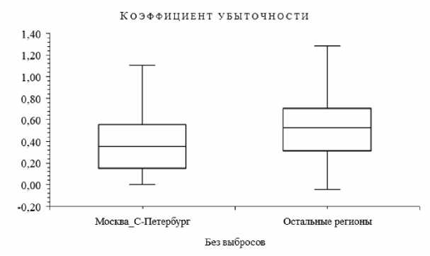 Региональные различия компаний наиболее наглядно иллюстрируют категорированные диаграммы Бокса – Вискера. Приведем эти графики для нескольких показателей, подкрепляя их проверкой различий с использованием критерия Краскела – Уоллиса.