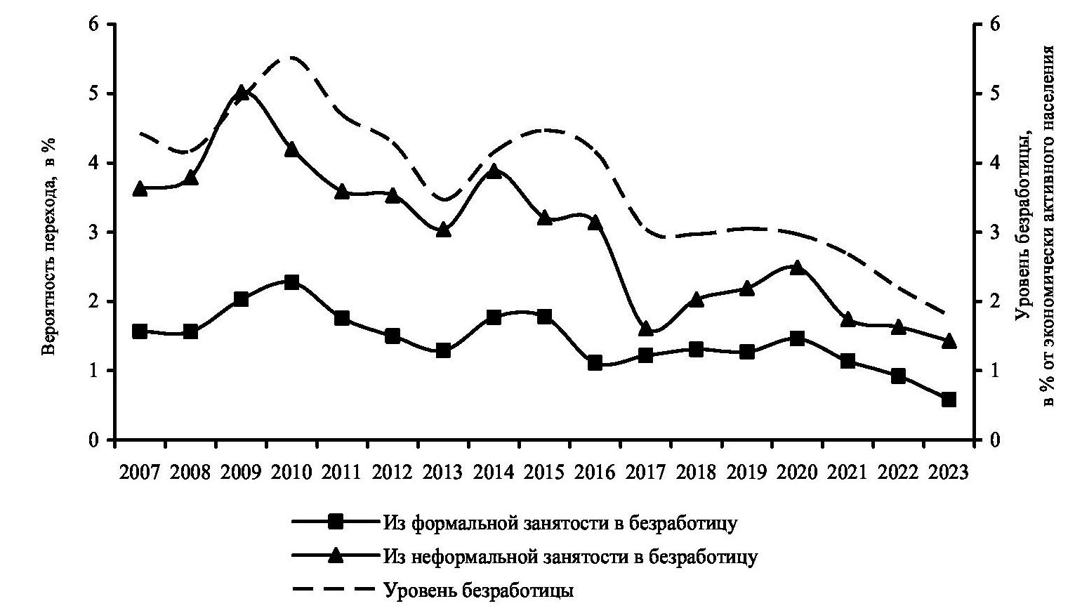 На рис. 2 изображены безусловные вероятности переходов из занятости различных типов в безработицу на российском рынке труда в 2007–2023 гг. При этом под неформальной занятостью понимался агрегированный показатель, суммирующий уровень занятости по найму без оформления в корпоративном секторе, занятость (по найму и не по найму) вне корпоративного сектора и нерегулярную занятость.