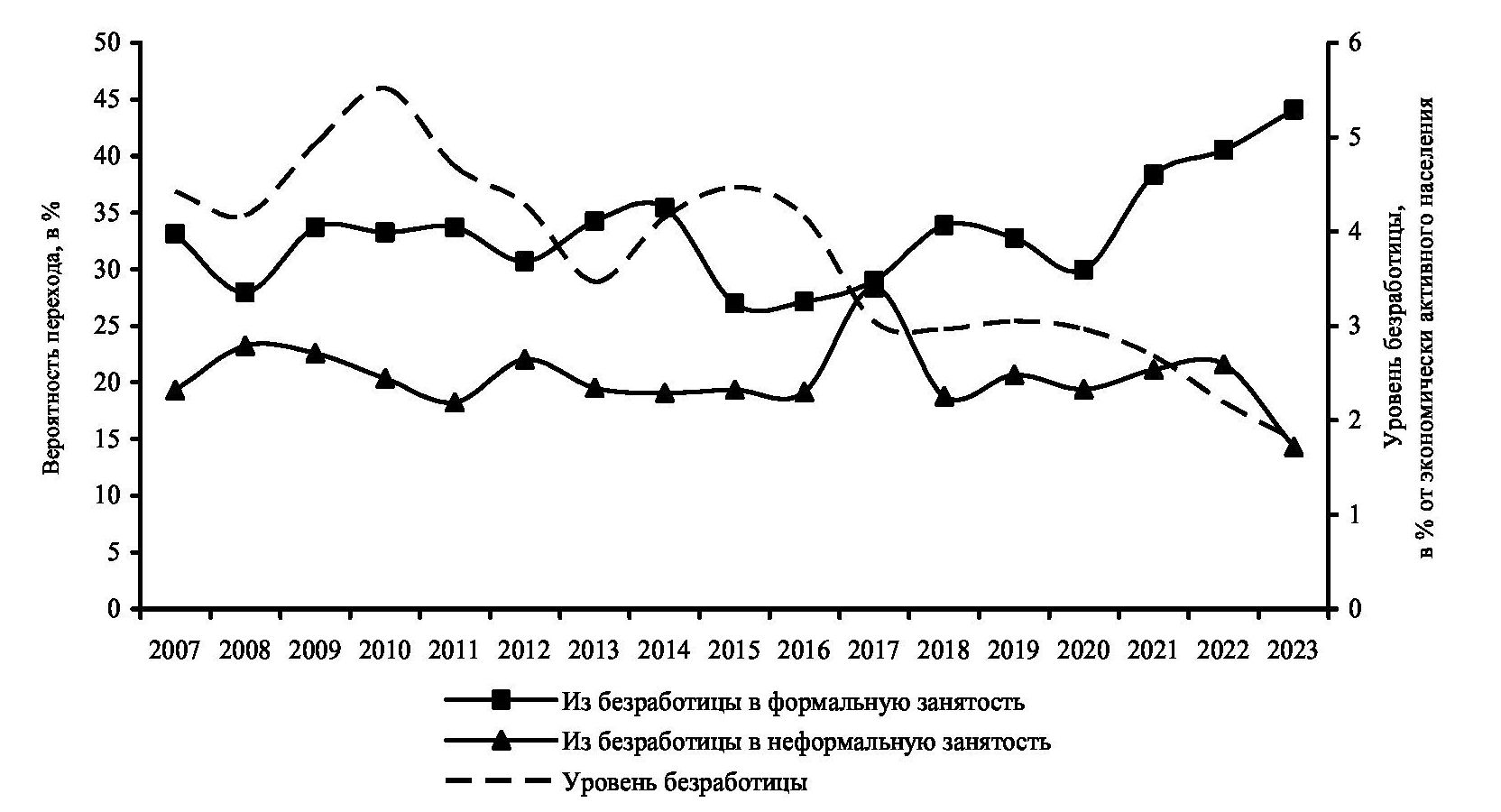 На рис. 3 представлены безусловные вероятности перехода из безработицы в занятость различных типов на российском рынке труда в 2007–2023 гг., соотнесенные с динамикой уровня безработицы.