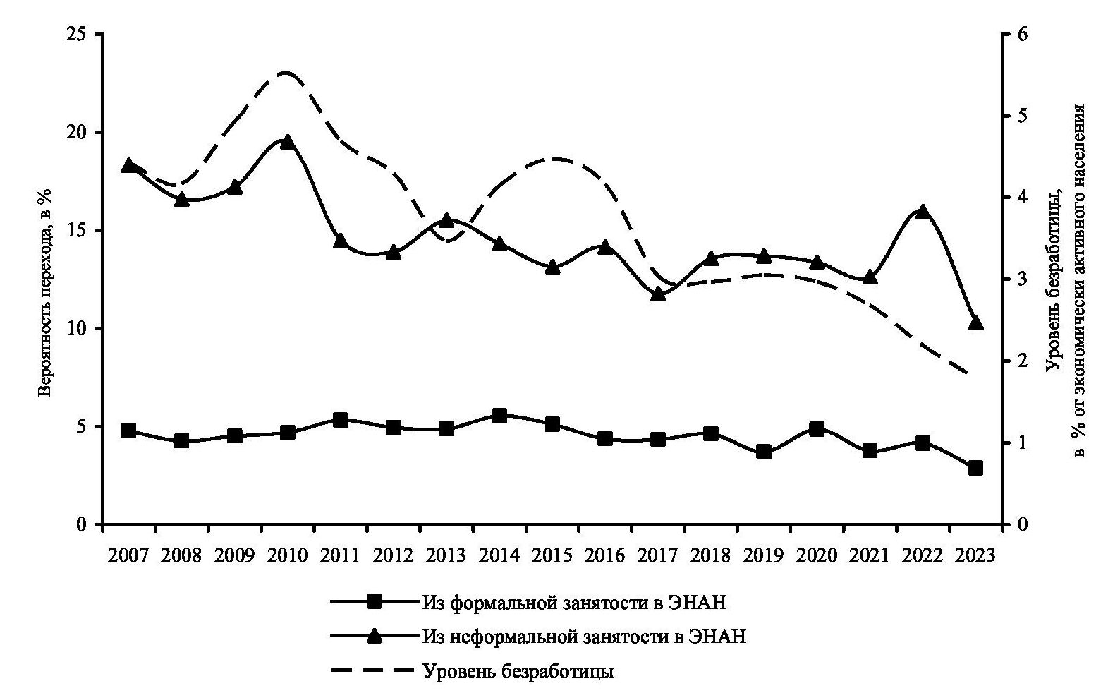 Настоящее исследование представляет собой первую попытку комплексного анализа динамики потоков рабочей силы между состояниями занятости различных типов, безработицы и пребывания вне рабочей силы на протяжении 2007–2023 гг. Устойчивое сосуществование формального и неформального сегментов рынка труда, а также значительный размер последнего, вне зависимости от используемого определения, традиционно являются важными атрибутами российского рынка труда. Неформальность выступала одним из ключевых механизмов адаптации к шоку перехода к рыночной системе в 1990-е годы и, несмотря на позитивную динамику ВВП в первой половине 2000-х годов, отнюдь не сократила свое присутствие на рынке труда. В то же время вопрос соотношения неформальной и формальной занятости и их совместной динамики по отношению к показателям безработицы в периоды негативных макроэкономических шоков остается открытым.