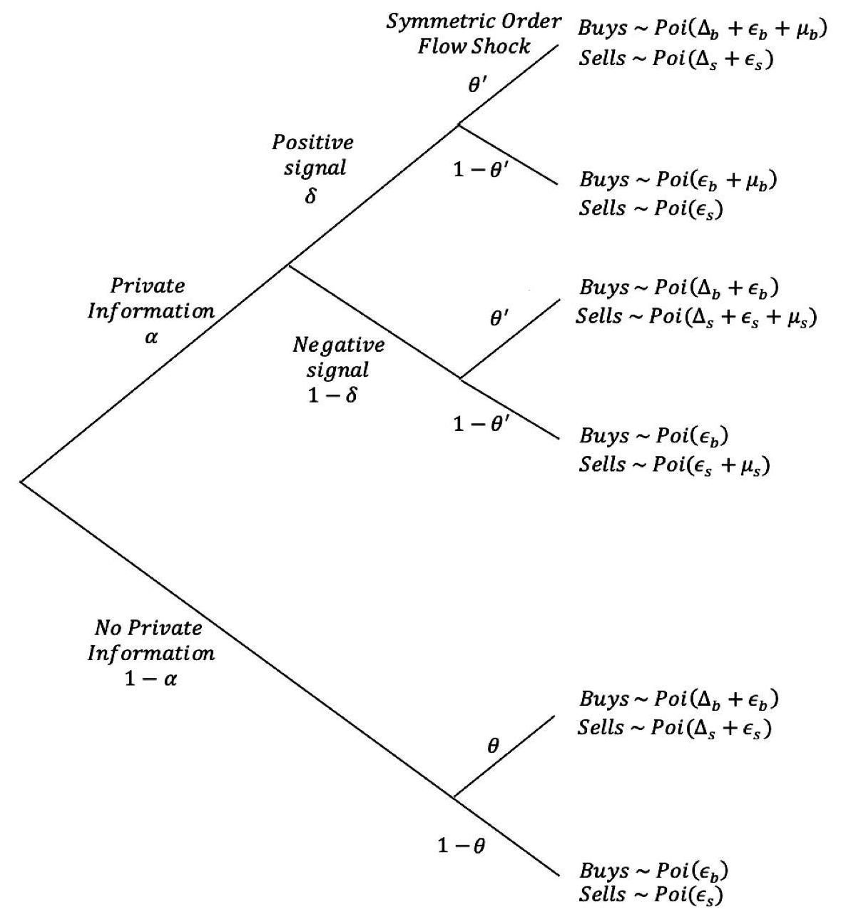 This model, introduced by Duarte and Young (2007) is an extension of PIN (EHO) model. As in the original model, there are two types of traders (insiders and noise), and with probability α there is a private information event, which can be either positive or negative with underlying probabilities δ and (1 − δ), respectively. However, we allow informed traders to be heterogeneous and perform Buy/Sell trades at different rates: µb and µs. Moreover, we introduce an event of symmetric order flow, leading to additional Sell (∆s) and Buy (∆b) orders at the same time. This modification enables the model to match the empirically observed positive correlation between Buy and Sell orders, which the traditional PIN model fails to do.