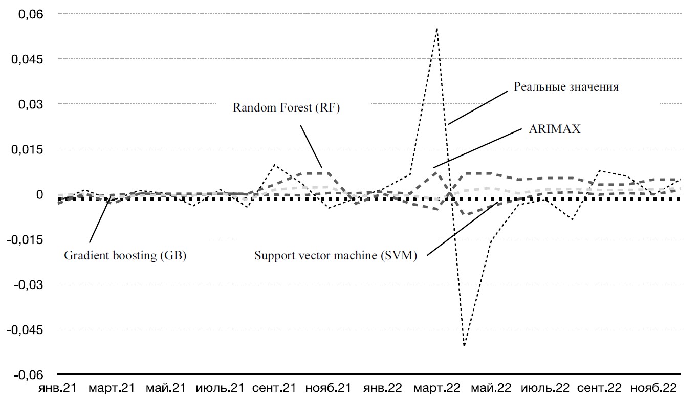 Бенчмарк (базовая модель) в работе – модель авторегрессии первого порядка AR(1). В целях сравнения моделей машинного обучения и эконометрических моделей по каждой модели машинного обучения мы рассматриваем отношение RMSEmodel к RMSEAR. Если значение показателя меньше единицы, то прогноз по сравниваемой модели лучше бенчмарка, если больше единицы – хуже. В исследовании используется прямая модель авторегрессии, в которой прогноз строится сразу на момент времени (t + k). Количество лагов в модели (p) подбирается с помощью Байесовского информационного критерия (BIC). Следуя методологии в исследовании [Семитуркин, Шевелев, 2022], помимо AR(1) в работе мы рассматриваем модель ARIMAX – модификацию модели авторегрессии-скользящей средней с включением дополнительных факторов. Как и в работе Семитуркина и Шевелева, в качестве внешнего фактора мы используем курс доллара США. Количество лагов в модели (p, q) выбрано на основании значения критерия BIC. Поскольку прогнозирование осуществляется в режиме псевдореального времени, для прогноза подставляется фактическое значение курса доллара. Такой подход имеет определенные ограничения, наиболее важное из которых заключается в том, что при переходе к прогнозированию в режиме реального времени значения валютного курса на несколько периодов вперед не представляется спрогнозировать с достаточной точностью. Тем не менее модельная оценка валютного курса может быть еще более смещенной, что побудило авторов статьи остановиться на использовании реальных значений курса и прогнозировании в режиме псевдореального времени.