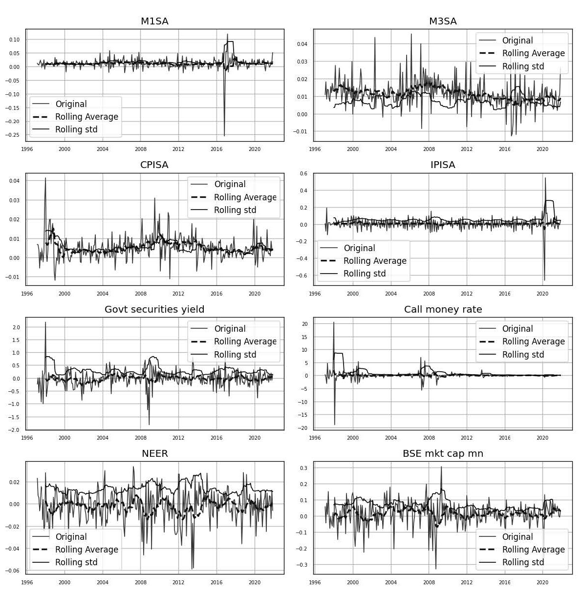The dataset used in our research comprises a monthly time series covering the period from 1997 to 2021, focusing on the Indian economy. The objective of our study is to forecast both the narrow monetary aggregate (M1) and the broad monetary aggregate (M3). To ensure accuracy in capturing the characteristics of these aggregates, we have to select an appropriate interest rate variable. Following the approach outlined by [Ball, 2012], we use the call money rate as the inte-rest rate variable for the M1 model, while the government securities yield is employed for the M3 model. Income is approximated using the Index of Industrial Production (IIP), and the nominal effective exchange rate is incorporated to capture exchange rate dynamics. To gauge the financial stability of the Indian economy, we adopt the market capitalization of the Bombay Stock Exchange (BSE) as a proxy. The dataset is sourced from CEIC, and we apply seasonal adjustments to IIP, CPI, M1, and M3 using the X13 ARIMA seasonal adjustment approach.