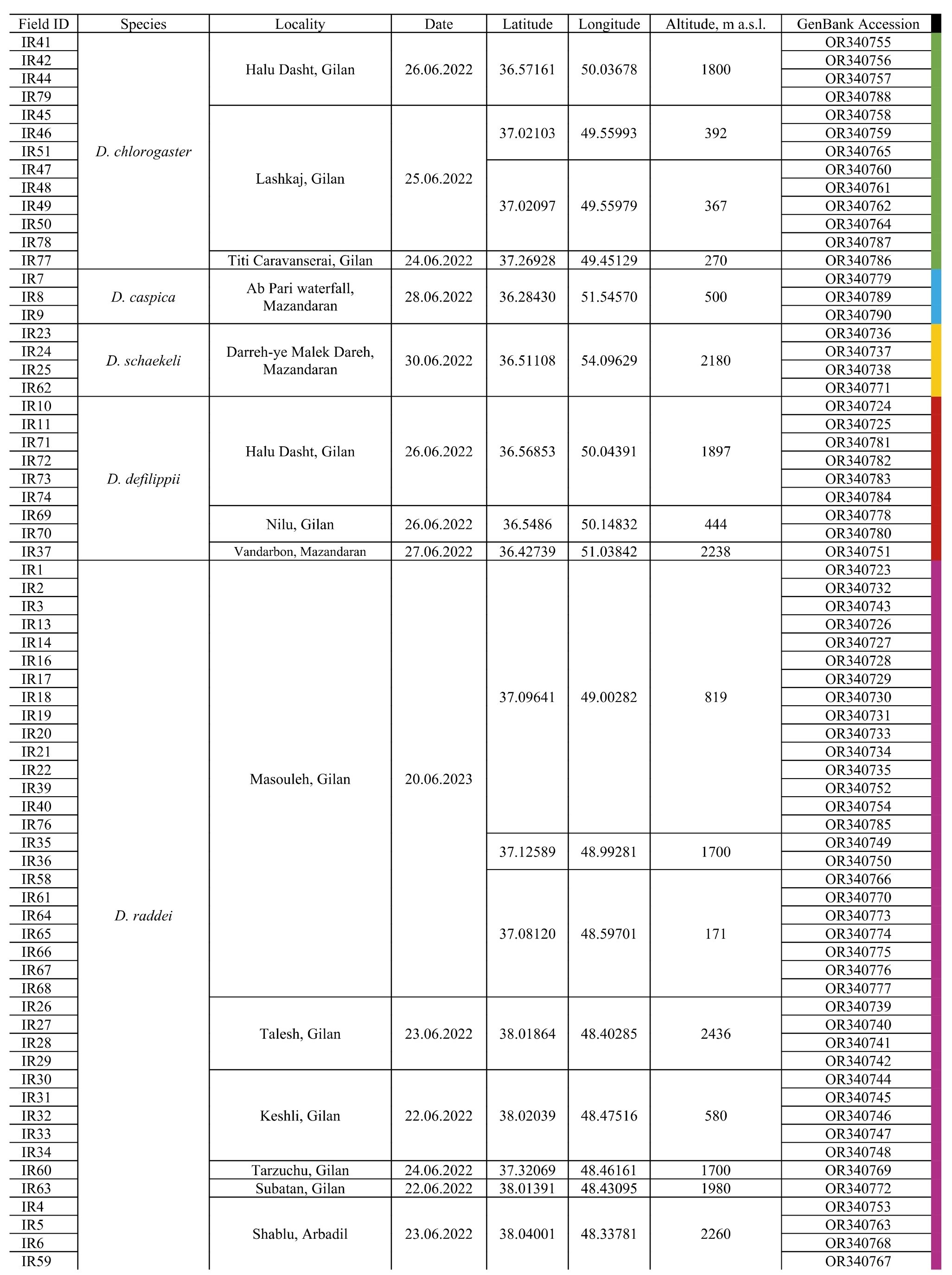 Tail tips of the lizards were fixed in 96% ethanol. Following species were included: 3 sp. belonging to D. caspica, 13 sp. to D. chlorogaster, 10 sp. to D. defilippii, 41 sp. to D. raddei and 4 sp. to D. schaekeli. Samples are stored in two instances: at the Hakim Sabzevari University and at the Severtsov Institute of Ecology and Evolution of the Russian Academy of Sciences.