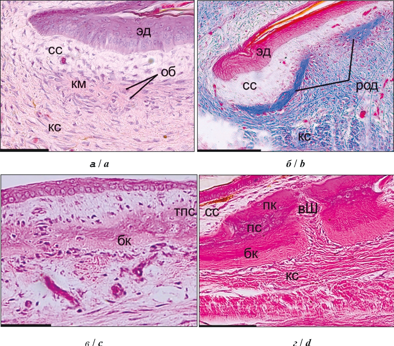 Fig. 2. Histologic sections of skin of regenerating tail of E. taeniolata at different stages of osteoderm microstructure formation: a – stage of dermal rudiment (scale – 50 μm), b – stage of primary mineralization (scale – 100 μm), c – stage of two-layer rudiment (scale – 50 μm), d – three-layer osteoderm (scale – 100 μm); бк – basal cortex, вШ – Sharpey's fibers, км – collagen matrix, кс – compact layer of dermis, об – osteoblasts, пк – superficial cortex, пс – intermediate layer, род – regenerating osteoderm, сс – papillary layer of dermis, тпс – tuberculated (intermediate) layer, эд – epidermis. Hematoxylin and eosin staining (a, c, d) and Heidengain azan (b)