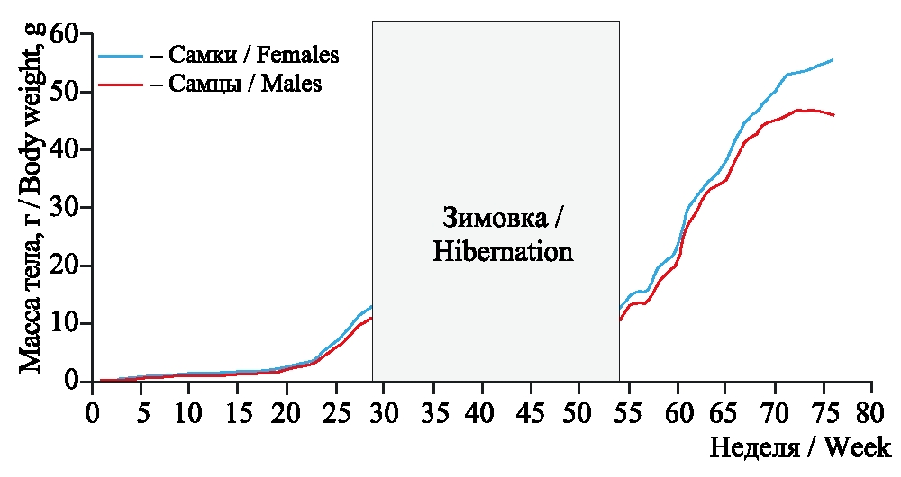 Относительные потери массы самцов и самок за период первой зимовки в среднем были практически одинаковыми (18.85 и 18.01% соответственно). На втором этапе зимние потери самцов были ощутимо выше – 19.44 и 12.54% соответственно.