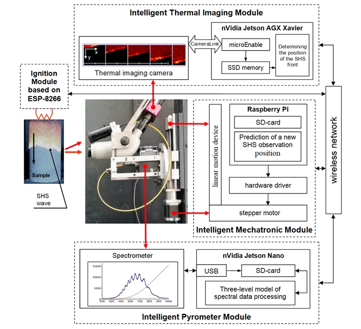 Results of research: Within the framework of the complex, a group of intelligent modules with autonomous data analysis in real time has been developed. The pyrometric module of the complex reveals structural phase transitions in the process of high-temperature synthesis of materials and measures characteristic temperatures. The thermal imaging module determines the position of the SHS wave front and plots the material and temperature phase distributions on the sample surface. The mechatronic module predicts the location of a new observation area, based on the measured parameters of the SHS process, and moves the optical control means there when the combustion wave leaves the current registration area. The interaction of intelligent modules of the mechatronic system is implemented through messages in a wireless network, and their synchronization via the NTP protocol has an error of about 40 μs.