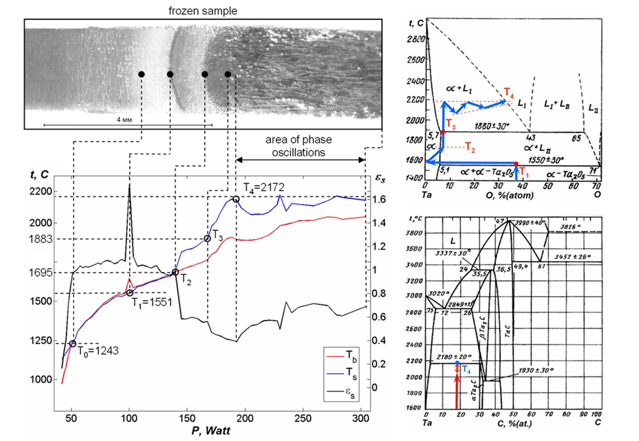 Согласно предложенной интерпретации результатов эксперимента T0 соответствует температуре насыщения поверхностного слоя образца примесными атомами O и C. При T1 происходит плавление эвтектики α-Ta + α-Ta2O5, что делает возможным растворение в ней примесных атомов и возникновение изотермического горения с образованием газообразных оксидов углерода, которые покидают образец. На изотермию горения указывает узость зоны новой фазы на замороженном образце и неизменность спектральной температуры, зависящей от формы спектра теплового излучения. При этом активация химических источников в поверхностном слое образца в дополнение к джоулевому тепловыделению приводит к резкому увеличению спектральной плотности потока излучения, что обнаруживается методом яркостной пирометрии. Конечно, в подобной точке εs не может быть оценкой спектральной степени черноты материала (в классическом понимании), но эта особенность позволяет с помощью ЯСКИ обнаруживать временный выброс или поглощение теплоты в химических реакциях, локализованных на дефектах структуры материала.
