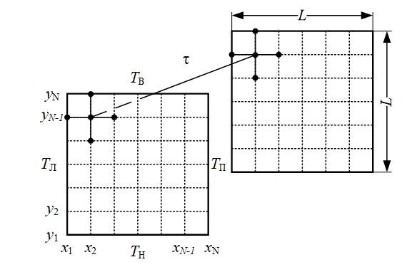 где – значение температуры в ij-м узле разностной сетки в последующий момент времени, – значение температуры в ij-м узле разностной сетки в n-й момент времени.
