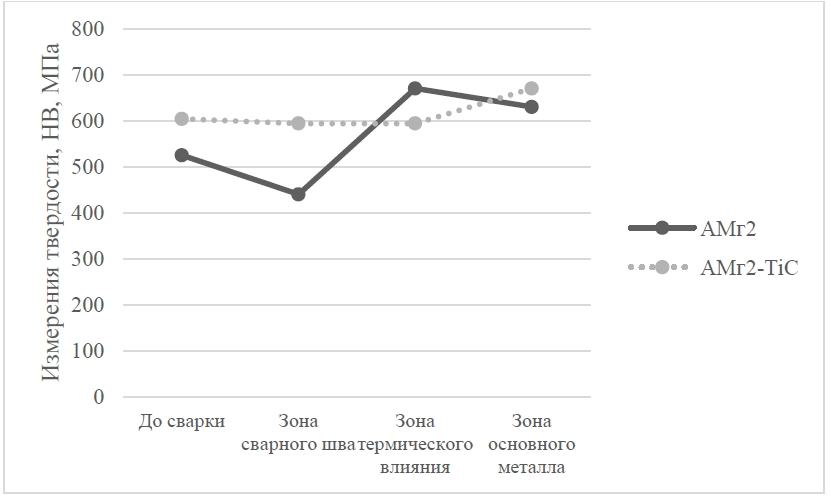 Таким образом, значения твердости сварного образца АМг2-TiC более стабильны, чем у матричного сплава АМг2. Также в зоне основного металла у композита наблюдаются наиболее высокие значения твердости, что объясняется присутствием частиц армирующей карбидной фазы.