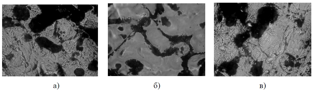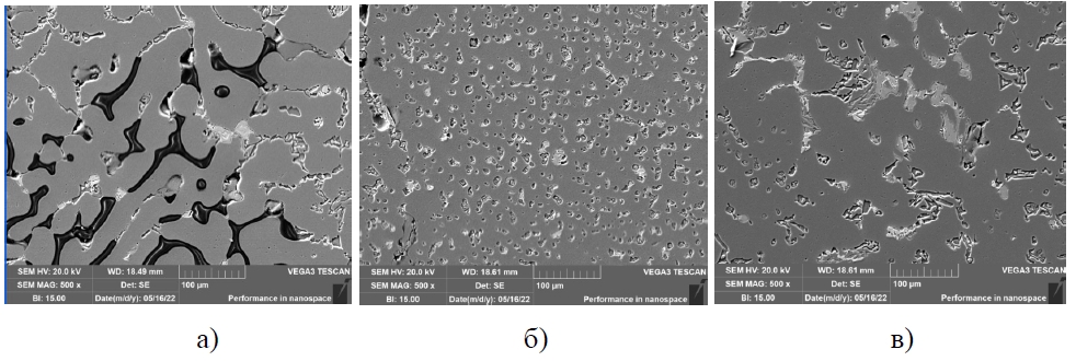 Рисунок 3 – Микроструктуры сварного образца АМг2 (увеличение 50 мкм): а) зона сварного шва; б) зона термического влияния; в) зона основого металла