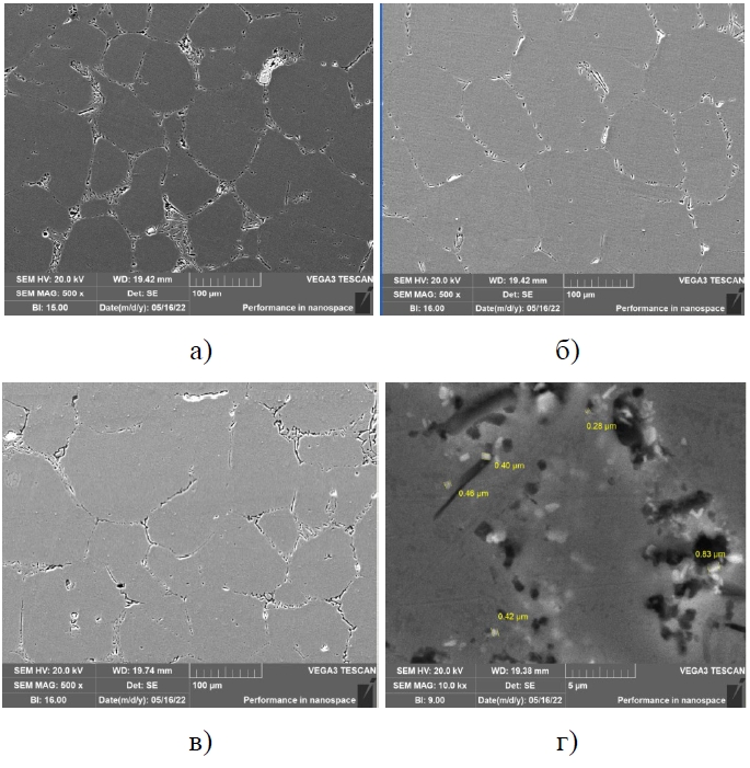 Рисунок 6 – Микроструктуры сварного образца композита АМг2-TiC: а) зона сварного шва; б) зона термического влияния; в) зона основного металла; г) карбидные включения в зоне основного металла