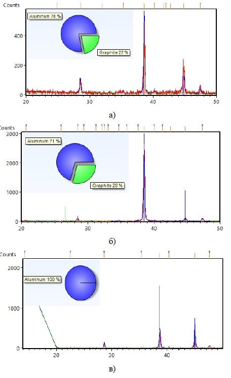 Рисунок 8 – Рентгенофазовый анализ АМг2-TiC: а) зона сварного шва; б) зона термического влияния; в) зона основного металла