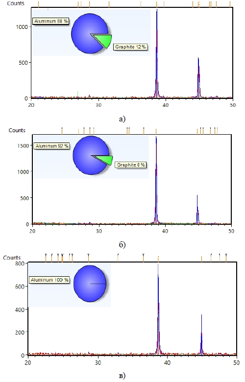 Рисунок 7 – Рентгенофазовый анализ сплава АМг2: а) зона сварного шва; б) зона термического влияния; в) зона основного металла