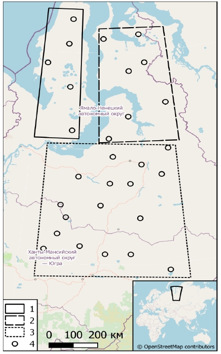 Рисунок 1 – Карта размещения тестовых участков на исследуемой территории в арктической зоне Западной Сибири. Обозначено: 1 – Ямальская тундра, 2 – Гыданская тундра, 3 – южная часть Западно-Сибирской Арктики, 4 – местоположение тестовых участков
