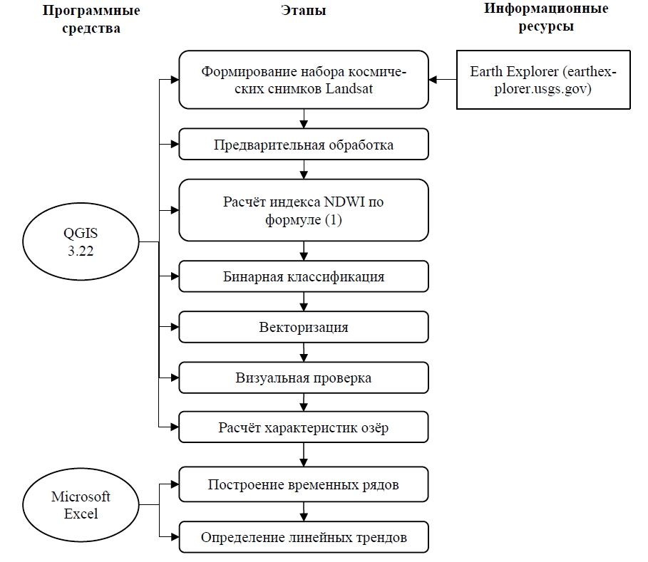 Процедура получения данных о пространственных характеристиках озер выполняется в виде последовательности этапов, представленных в виде схемы на рисунке 2. На схеме также показаны информационные ресурсы и программные средства, используемые при выполнении разных этапов. На территорию исследования сформирована коллекция безоблачных космических снимков Landsat 4, 5, 7, 8 за 36-летний период. Для каждого снимка производилась предварительная обработка, как указано в [11], рассчитывался индекс NDWI. В результате было получено новое растровое изображение (растр), каждая ячейка которого содержала значение индекса. Путём визуального анализа определялось пороговое значение индекса, позволяющее разделять водные объекты и объекты суши. С использованием порогового значения проводилась бинарная классификация растра, в ходе которой все значения, лежащие выше порогового (водные объекты), получали значение 1, а объекты ниже порогового уровня получали значение 0. В результате получался новый растр, ячейки которого содержали информацию только о водных объектах.
