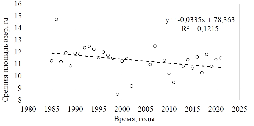 Как видно из рисунка 3, временной ряд средних значений площади озер показывает отрицательный линейный тренд, что иллюстрируется пунктирной линией на графике. Это демонстрирует тенденцию сокращения во времени площади озер в Западно-Сибирской Арктике в период 1985–2021 гг. Заметим, что эта же тенденция сокращения в среднем площадей озер на этой территории наблюдалась, по данным [6], и в более ранний период исследований 1973–2008 гг.