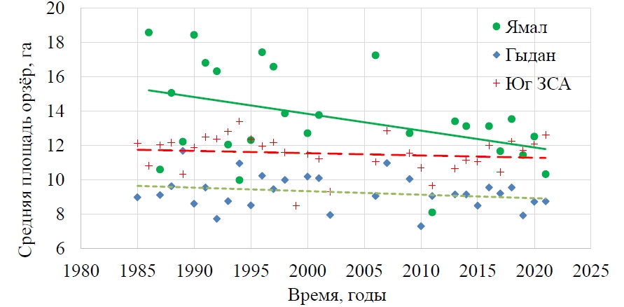Для изучения особенностей динамики площадей озер на территориях в разных экорегионах Западной Сибири на рисунке 4 представлены в графическом виде временные ряды данных о средней площади озер для трех разных экорегионов Западно-Сибирской Арктики. Аппроксимация временных рядов, проведенная в соответствии с (2), позволила определить линейные тренды изменений площади озер в разных экорегионах, отображаемые на рисунке 4 прямыми линиями (сплошной – для Ямала, крупной шриховкой – для южной части ЗСА, мелкой штриховкой – для Гыдана).