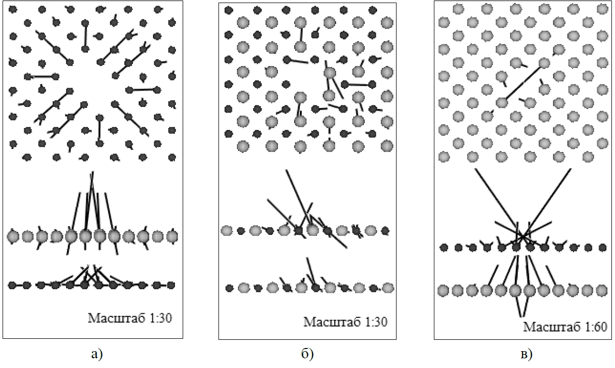 Рисунок 5 – Картины атомных смещений вблизи бивакансионного комплекса: а) Cu-Cu; б) Cu-Au; в) Au-Au