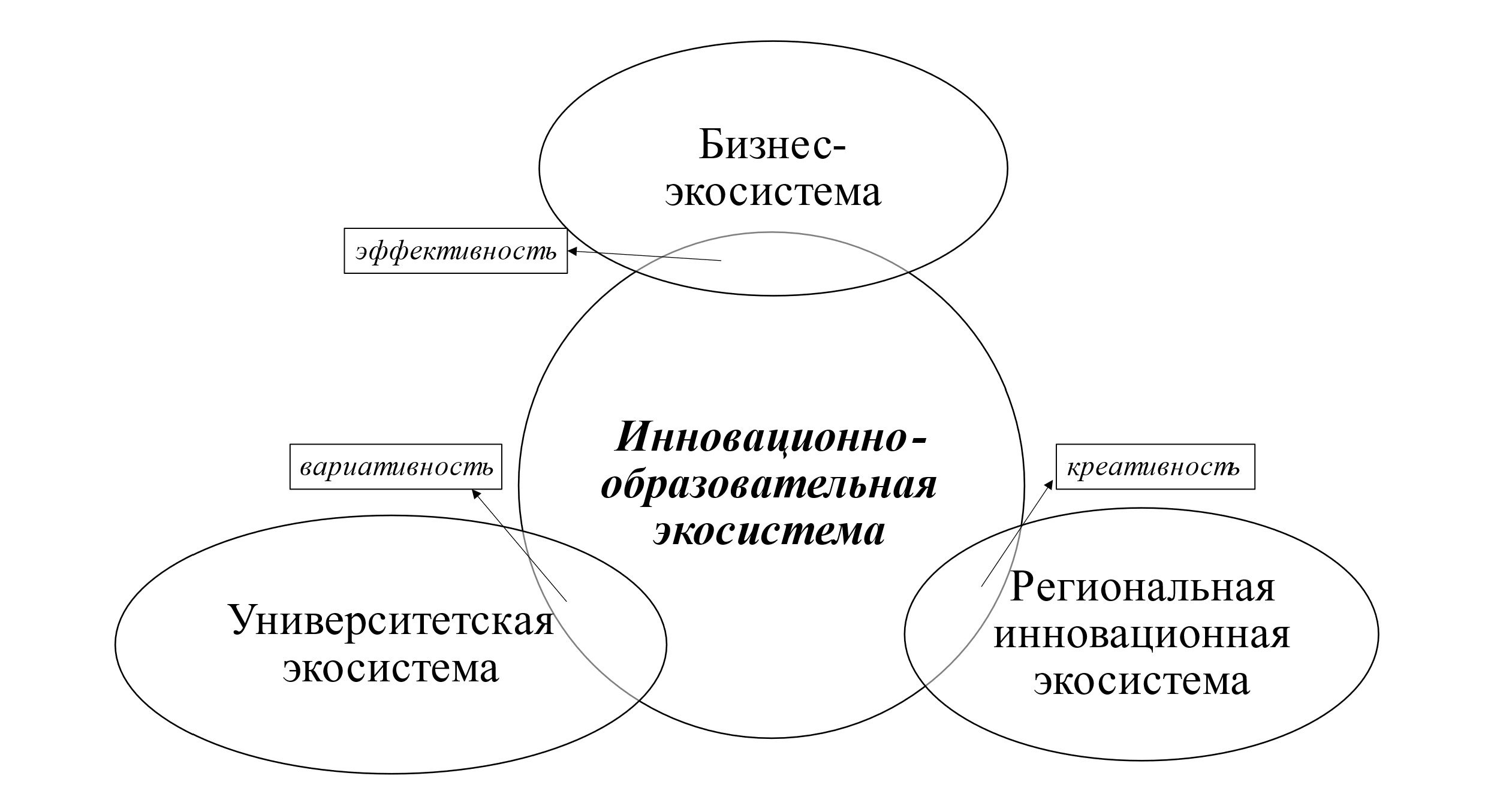 Именно комплексный, многосубъектный подход к анализу инновационно-образовательных экосистем позволяет рассматривать их как потенциально перспективную модель организации системы высшего образования России, в которой обозначенная исследователями [7] специфика экосистемного подхода в управлении устойчивостью и в достижении оптимального баланса влияния отдельных участников в условиях постоянно меняющейся внешней среды реализуется в развитие человеческого капитала на паритетных началах через традиции (с усиленной фундаментальной подготовкой), государственные стандарты и национальные цели развития, а также рыночные требования к конкурентоспособности, практикоориентированности, индивидуализации и инновационности.