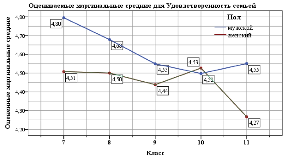 Оценку семьи можно признать позитивной. Варьируясь в среднем около 4,5 баллов (5-балльная шкала) это свидетельствует о высокой поддержке со стороны семьи учащихся и положительной оценке своего благополучия в семье. Отметим, что снижение оценки по классам также незначительно и составляет менее 0,3 балла.