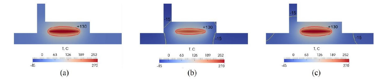 Рисунок 2 – Изотермы 130 °С в сечении седлового отвода и трубы в момент завершения нагрева при приварке по стандартной и предлагаемой технологиям: а) 10 °C; б) -45 °С; в) – 45 °С по предлагаемой технологии