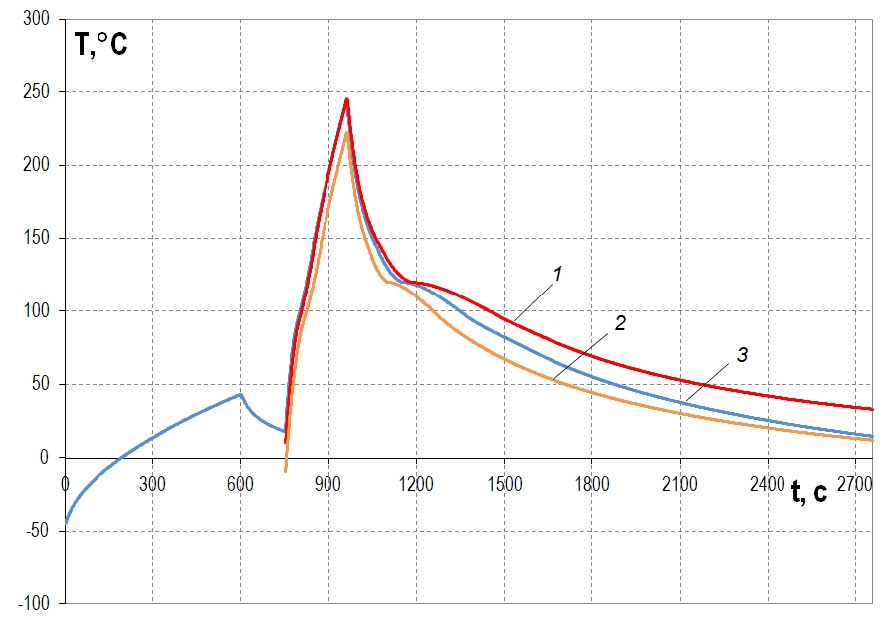 Рисунок 4 – Временные зависимости температур в точке между трубой и седловым отводом при приварке при температурах окружающего воздуха +10°С (1), -10°С (2) по стандартной технологии и минус 45 °С (3) по предлагаемой технологии