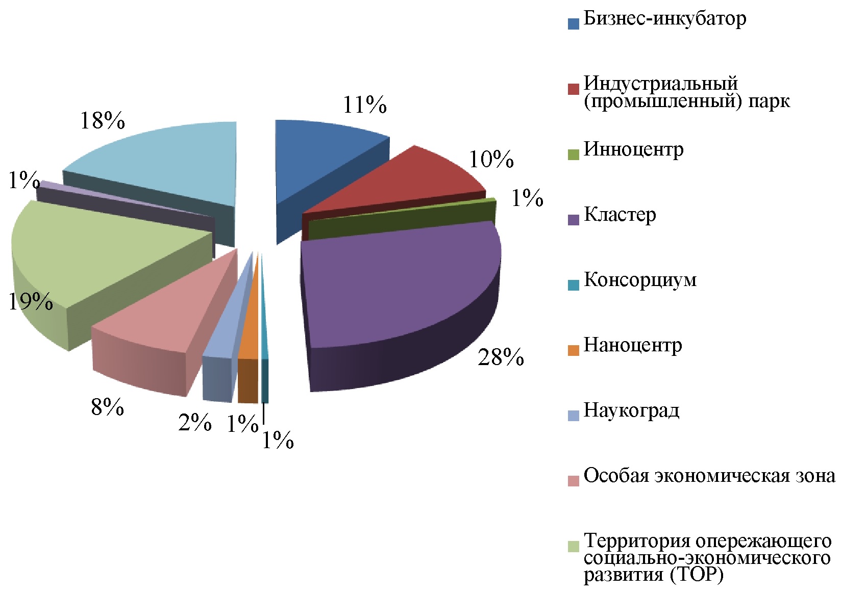 Наибольшую долю в структуре объектов инновационной инфраструктуры России составляют кластеры (28 %, 170 единиц), ТОР (19 %, 115 единиц) и технопарки (18 %, 111 единиц). Кластеры как форма интеграции науки, образования и бизнеса представлены на рынке инноваций слабо, в основном действуют туристско-рекреационные кластеры (например туристско-рекреационный кластер Калужской области http://airko.org/clusters/turist-cluster), промышленные кластеры (например Авиационный промышленный кластер Республики Башкортостан, https://ak-rb.ru/), фармацевтические и медицинские кластеры (например Медико-биологический кластер Республики Крым, https://ckr.frbk.ru/cluster-category/med-cluster/) и IT-кластеры (например кластер «Smart Technologies Tomsk», http://innoclusters.ru/klastery-tomskoy-oblasti/biofarmacjevtichjeskij-klastjer/). Образовательные организации высшего образования представлены как ключевые субъекты только в IT-кластерах, реализующих программы, направленные на коммерциализацию информационно-телекоммуникационных инноваций для динамичного роста и повышения конкурентоспособности региональной экономики. Отметим, что во многих регионах страны не существует ни одного кластера как объекта инновационной инфраструктуры.