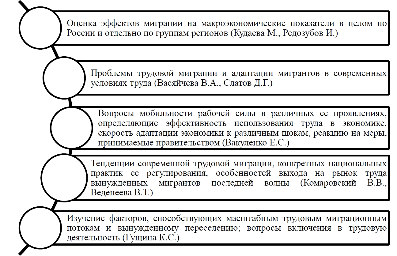 Вопросы, касаемые вынужденной миграции и её роли в структуре рынка труда, находим в работах М. Кудаева, И. Редозубова, В.А. Васяйчевой, Д.Г. Слатова, Е.С. Вакуленко, А.А. Тарасьев, Комаровский В.В., Веденеева В.Т., Гущина К.С. и др. исследователей. Круг рассматриваемых ими вопросов представлен на рисунке 1.