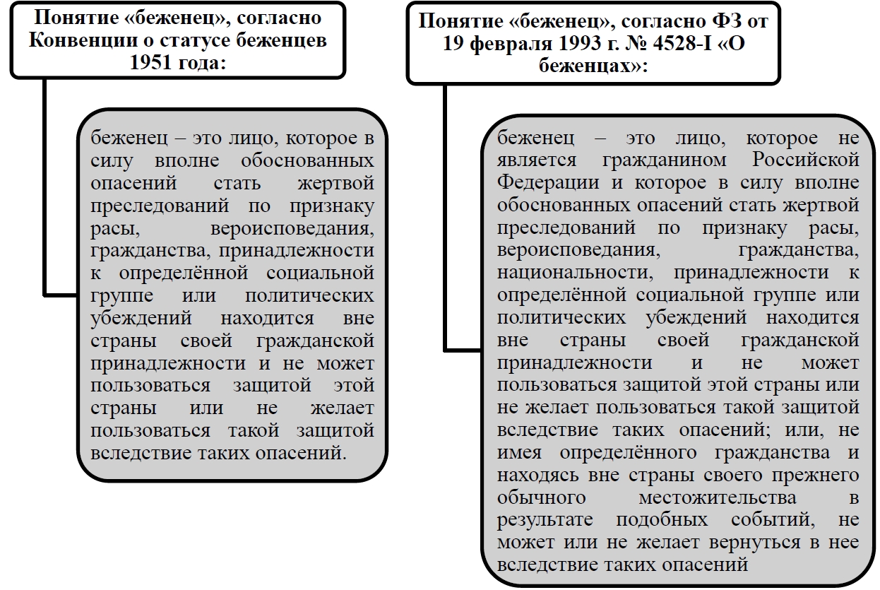 Рисунок 2 – Определение понятия «беженец» согласно Женевской Конвенции о статусе беженцев 1951 года и ФЗ РФ от 19 февраля 1993 г. № 4528-I «О беженцах» (Источник: согласно: [14-15])