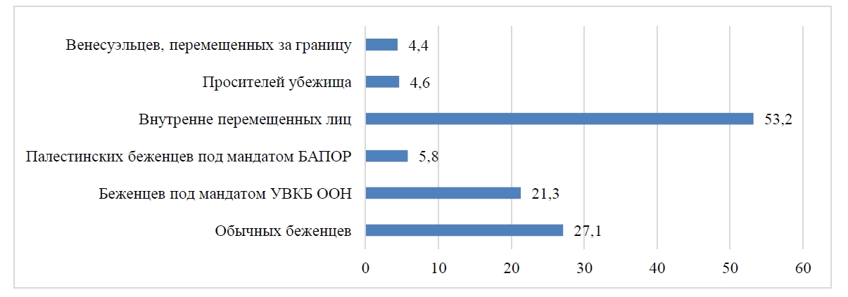 В начале 2022 г. результате преследований, военных конфликтов, насилия, нарушений прав человека или других событий, были вынуждены покинуть свои дома более 100 млн чел. во всём мире. На рисунке 5 представлены данные ООН о численности беженцев и просителей убежища из стран, на которые сегодня приходится наибольшее число вынужденных мигрантов в мире.