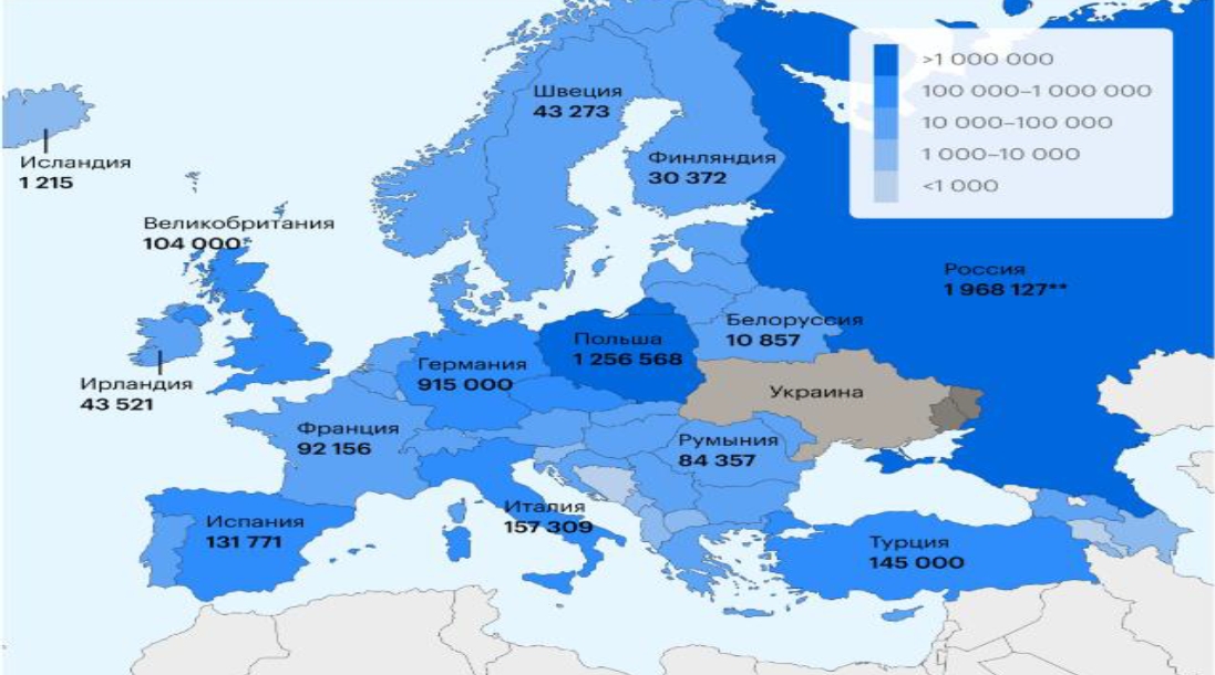 Рисунок 6 – Страны, принявшие вынужденных мигрантов из Украины (данные на рисунке на начало августа 2022 г.), тыс. чел. (Источник: согласно: [30])