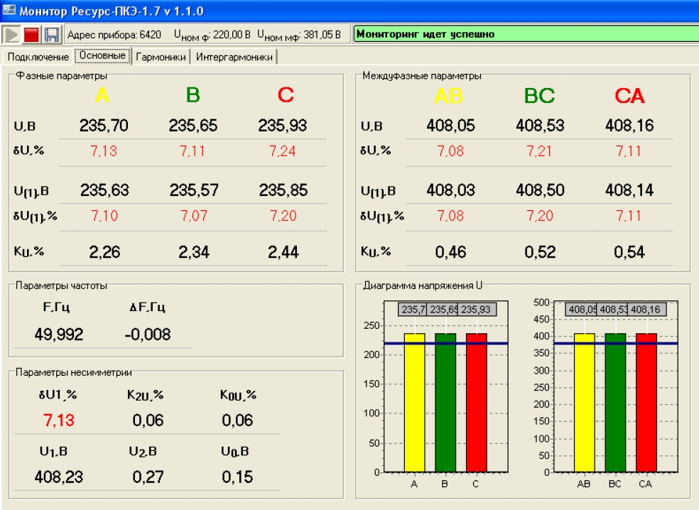 С помощью прибора «Ресурс-ПКЭ» в данном случае измеряются значения суммарных гармонических составляющих напряжения (KU) и коэффициента n-ой гармонической составляющей напряжения (KU(n)). С помощью персонального компьютера, подключенного к Ресурсу-ПКЭ через интерфейс RS-232, визуализируются все полученные результаты измерений.