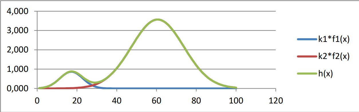Значения величин k1, k2, μ1, μ2, σ1, σ1 находим, минимизируя функционал (9)[ 6], учитывая их неотрицательность, требования к математическим ожиданиям μ1 < μ2 ≤ 100 и ограничения на среднеквадратические отклонения с учетом «правила трех сигм» для попадания теоретических баллов в диапазон от 0 до 100.