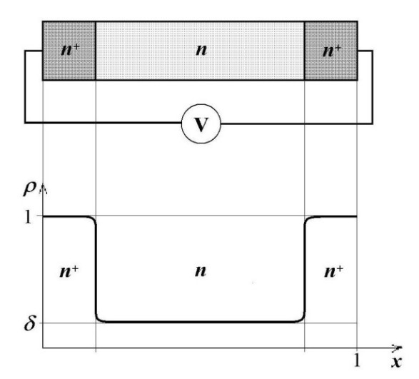 Сформулированная задача (1) – (5) является одномерной задачей о баллистическом диоде. Это полупроводниковый прибор, состоящий из трех областей. Первую и третью области называют n+ - зонами. Они имеют высокую концентрацию легирования. Средняя область имеет низкую концентрацию легирования и называется n - зоной.