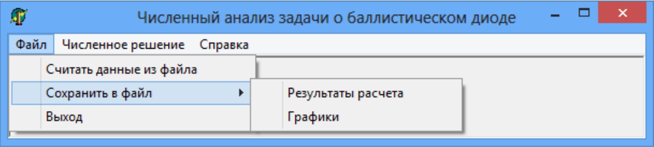 Для реализации и тестирования описанных вычислительных схем, разработана система «Численный анализ задачи о баллистическом диоде». Меню системы представлено на рисунке 2.
