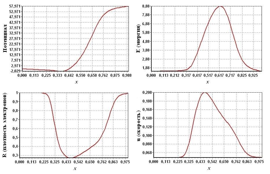 Где R – плотность электронов, u – скорость электронов, q – поток энергии, J = Ru, I = Rq, φ – электрический потенциал, Q = φx, E – энергия электронов, , , ε > 0 – константа, ρ = ρ(x), c, c11, c12, c21, c22 – коэффициенты, зависящие от энергии E [2, 3].