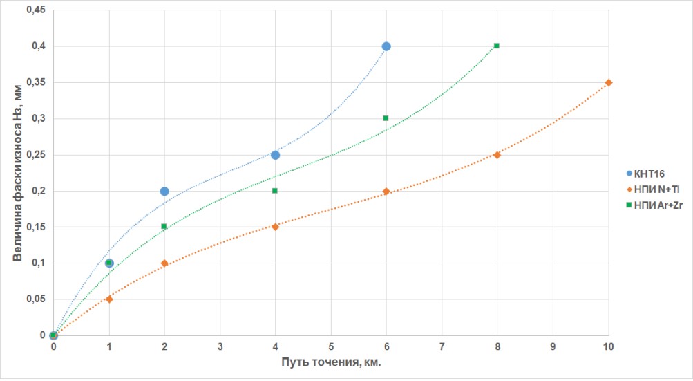 На рисунке 1 представлены результаты исследования кинетики изнашивания модифицированных НПИ и исходных трёхгранных пластин БВТС марки КНТ16 при чистовом точении стали 40ХН. Токарная обработка прутков проводилась при следующих режимах: скорость резания v = 106 м/мин, подача S = 0,15 мм/об., глубина резания t = 0,15 мм. Критерием изменения износостойкости служила зависимость величины фаски по задней поверхности пластин от пройденного пути точения.