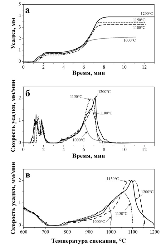 Рисунок 2 – Уплотнение порошка смесевой композиции WC с 10мас. %Co при температурах ИПС 1000, 1100, 1150 и 1200 °C: а – уплотнение (усадка) / время; б – скорость уплотнения / температура; в – скорость уплотнения / время