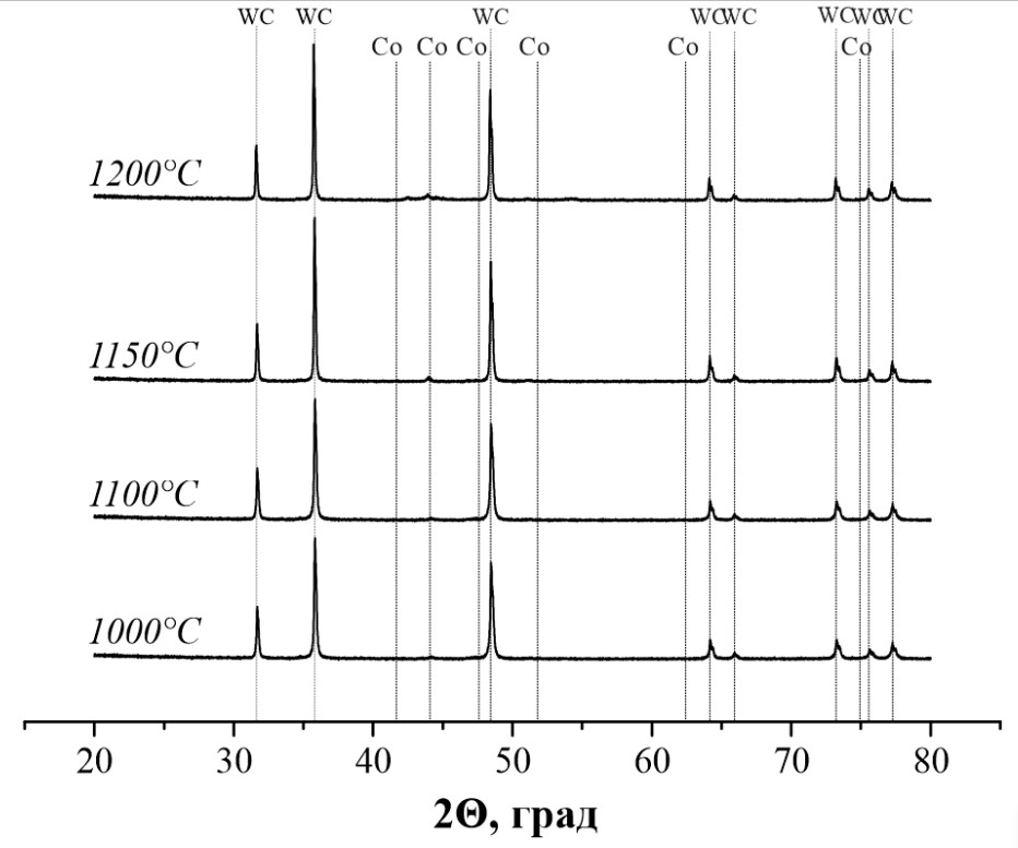 Рисунок 3– Фазовый состав твердых сплавов WC-10мас.%Co, полученных методом ИПС при температурах 1000, 1100, 1150 и 1200 °C и постоянном давлении прессования 57,3 МПа