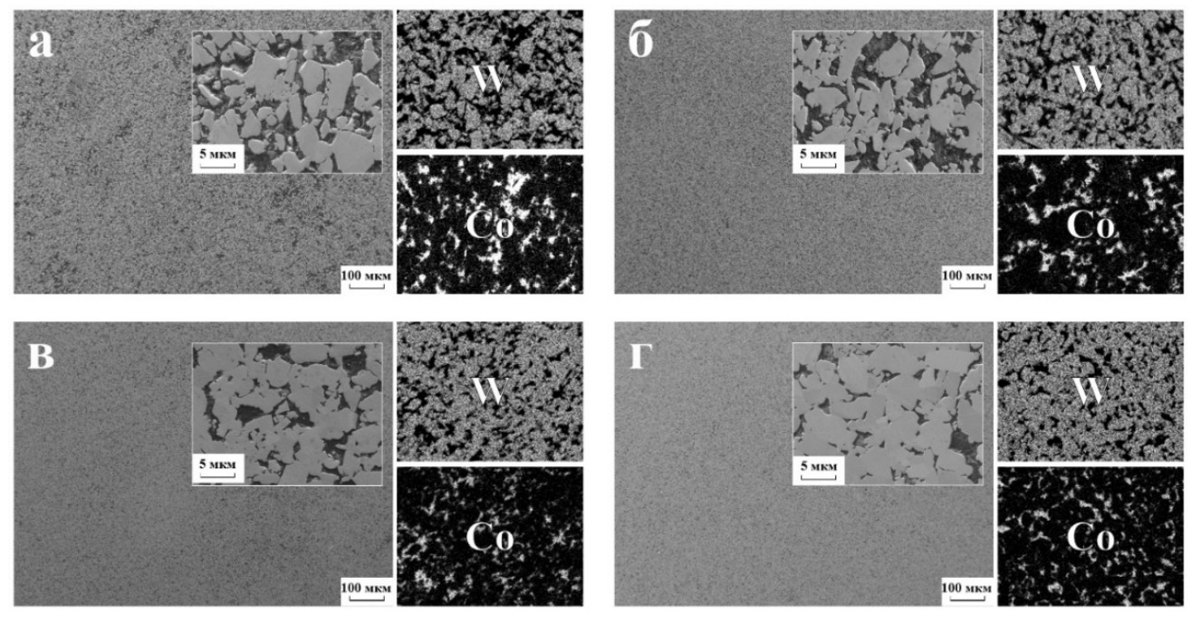 Рисунок 4 – РЭМ изображения и ЭДС карты распределения элементов в ТС композиции WC-10мас.%Co, полученных ИПС при температурах спекания (а) 1000 °C, (б) 1100 °C, (в) 1150 °C и (г) 1200 °C