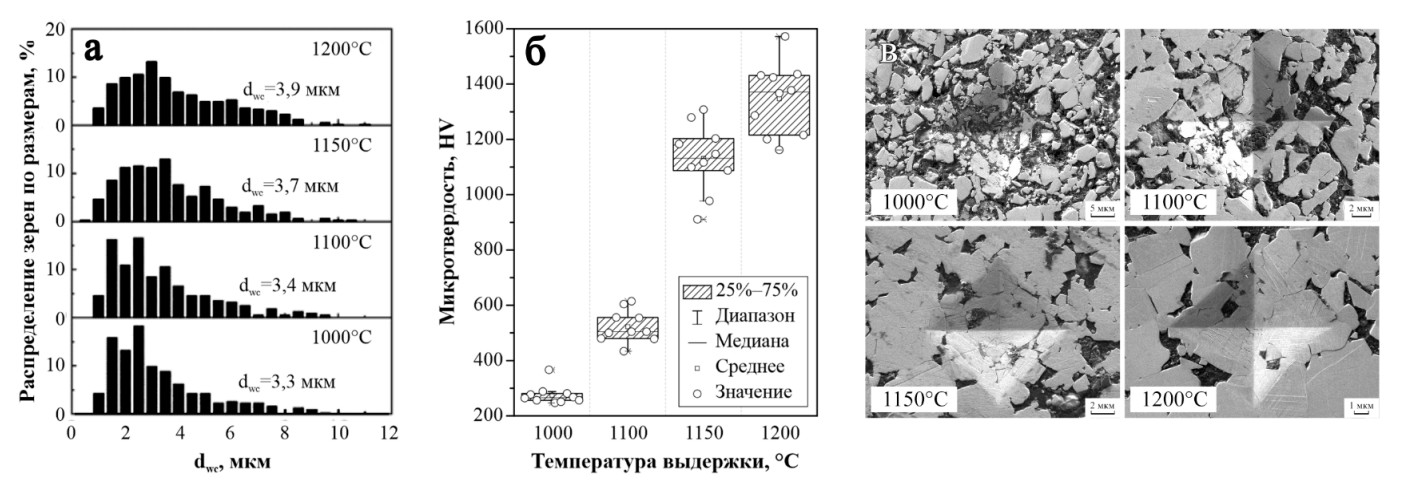 Рисунок 5 – Характеристики ТС WC-10мас.%Co, полученных ИПС при 1000, 1100, 1150 и 1200 °C:(а) гранулометрический состав зерна; (б) дисперсия значений микротвердости по Виккерсу и (в) микрофотографии отпечатков индентора микротвердости при HV0,5 на поверхности исследуемых образцов