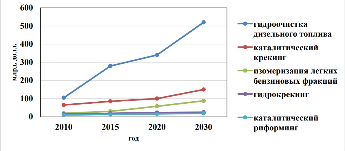 Катализаторы применяются во многих технологических процессах нефтеперерабатывающем и химических секторах. Объем мирового рынка катализаторов нефтепереработки оценивается в 3,7 млрд. долл. в 2021 Ежегодно прирост ожидается порядка 3% и к 2026 рынок вырастет до 4,3 млрд. долл. [1] Оценка динамики российского рынка катализаторов до 2030 представлена на рисунке 1.