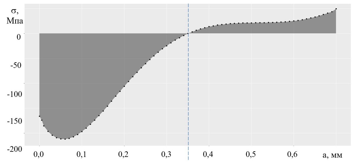 Программное обеспечение в автоматизированном режиме строит эпюру аппроксимированных значений остаточных напряжений по глубине упрочнённого слоя образца.