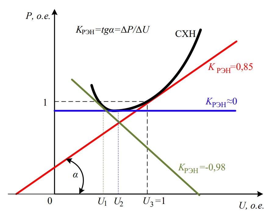 Особый интерес вызывает идея использования регулирующего эффекта нагрузки узла энергосистемы для выработки управляющего воздействия направленного на снижения перетоков мощности по перегруженному элементу электрической сети, что позволяет управлять перетоком мощности, не производя коммутационных переключений и не вводя ограничений потребителям [5, 6]. Численно регулирующий эффект нагрузки характеризуется коэффициентом (КРЭН), представляющим собой тангенс угла касательной к СХН проведенной в точке конкретного напряжения рисунок 1.