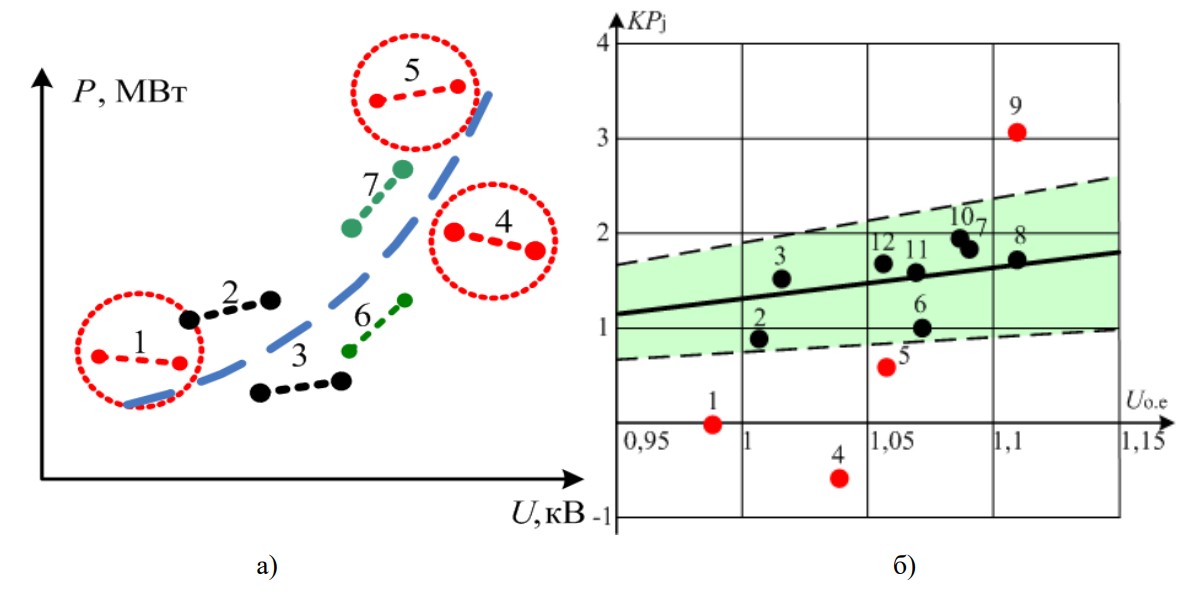 Как видно из рисунка 1 использование регулирующего эффекта нагрузки перспективно для оперативного диспетчерского управления. Зная величину КРЭН можно воздействием на напряжение добиться снижения перетока мощности, что особенно актуально при возникновении перегрузки на элементе энергосистеме [7, 8]. Например, если КРЭН >0 снижение перетока мощности производится путем снижения напряжения, если КРЭН <0 снижение перетока мощности производится путем увеличения напряжения, а если КРЭН ≈ 0, регулирующий эффект нагрузки отсутствует [5].